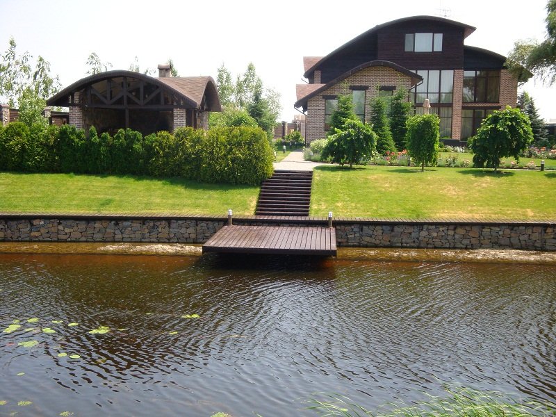 Габионы так же используются в качестве водных сооружений. Они прекрасно упрочняют береговую линию декоративного пруда.