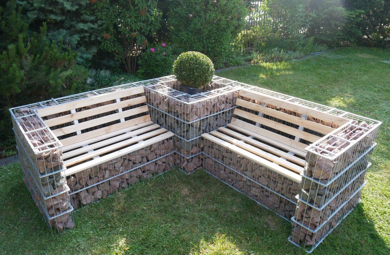 Еще один замечательный способ использование габионов для сооружения садовой мебели (столика, скамейки)