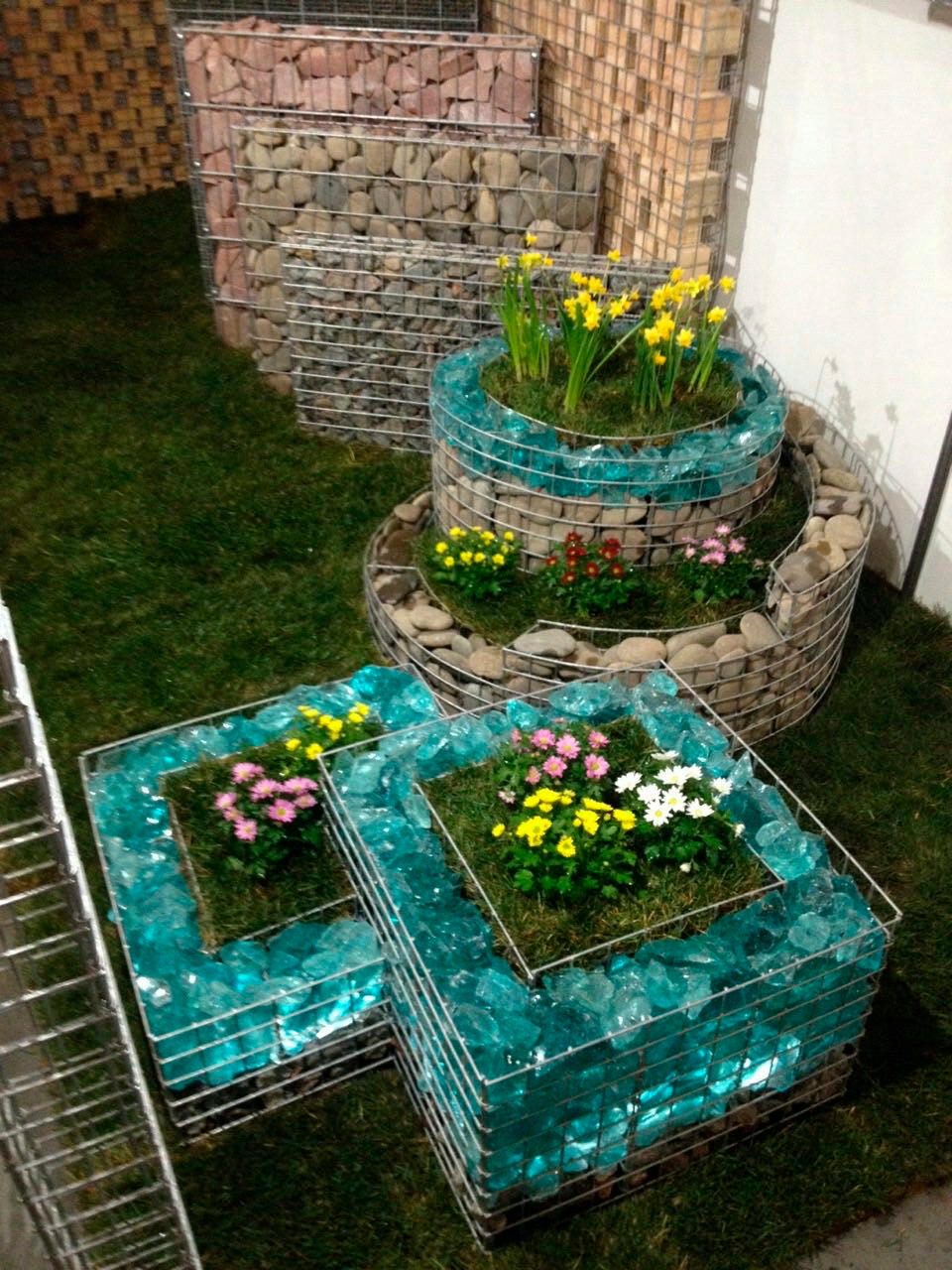 2) Цветное стекло (укладка в габионные сооружения отходов стекольного производства. Крупные осколки стекла различных оттенков и их чередование).
